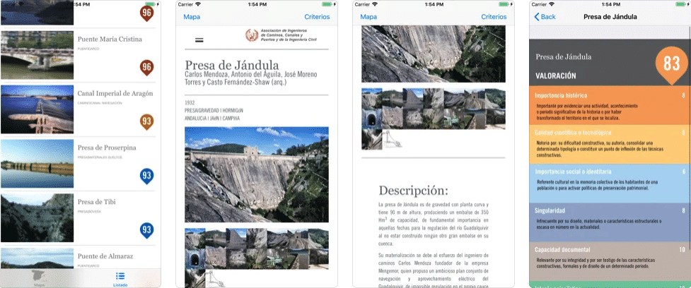 El proyecto se materializó en una selección de obras de ingeniería diversas en su tipología, cuyas características, geolocalización, valoración de acuerdo con una metodología específica, etc. se ha recogido en una app que hoy día se encuentra disponible tanto en los sistemas propios de Apple como de Android.